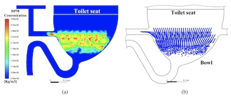 “It is clear from daily experience that flushing a toilet generates strong turbulence within the bowl. Will this flushing-induced turbulent flow expel aerosol particles containing viruses out of the bowl? This paper adopts computational fluid dynamics to explore and visualize the characteristics of fluid flow during toilet flushing and the influence of flushing on the spread of virus aerosol particles…. The simulation results are alarming in that massive upward transport of virus particles is observed, with 40%–60% of particles reaching above the toilet seat, leading to large-scale virus spread. Suggestions concerning safer toilet use and recommendations for a better toilet design are also provided.”
